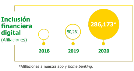 Al cierre del 2020, logramos 286,173 nuevas afiliaciones a nuestra app y home banking (www.mibanco.com.pe). Una cifra que representa un crecimiento del 469% respecto al 2019 y nos consolida como el banco líder de las microfinanzas en el país.